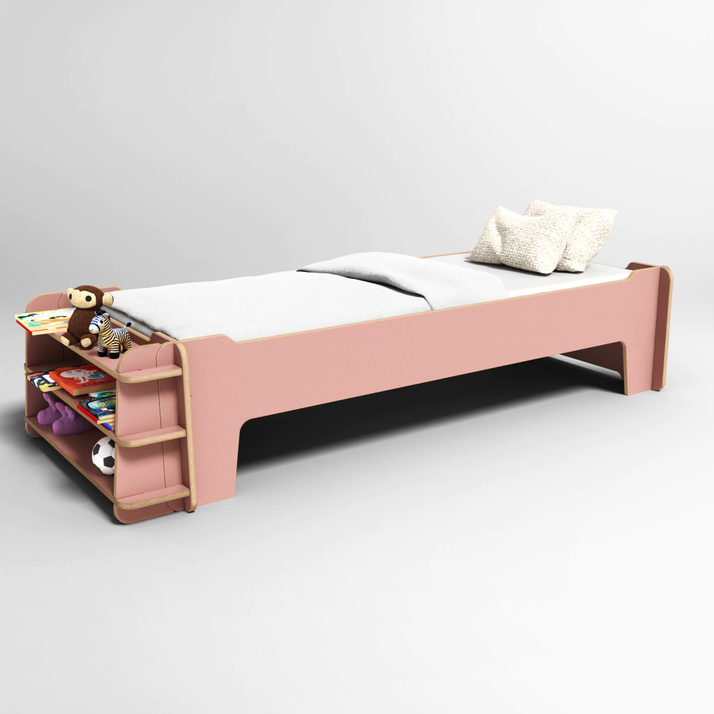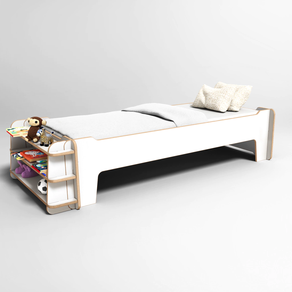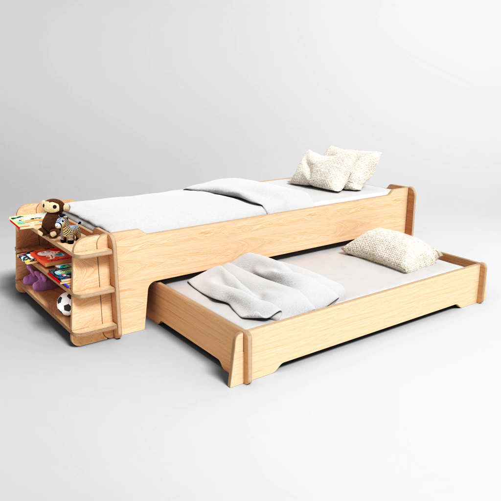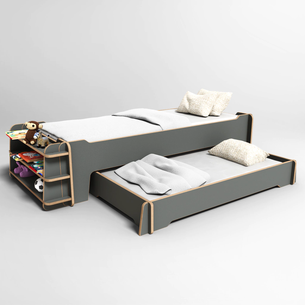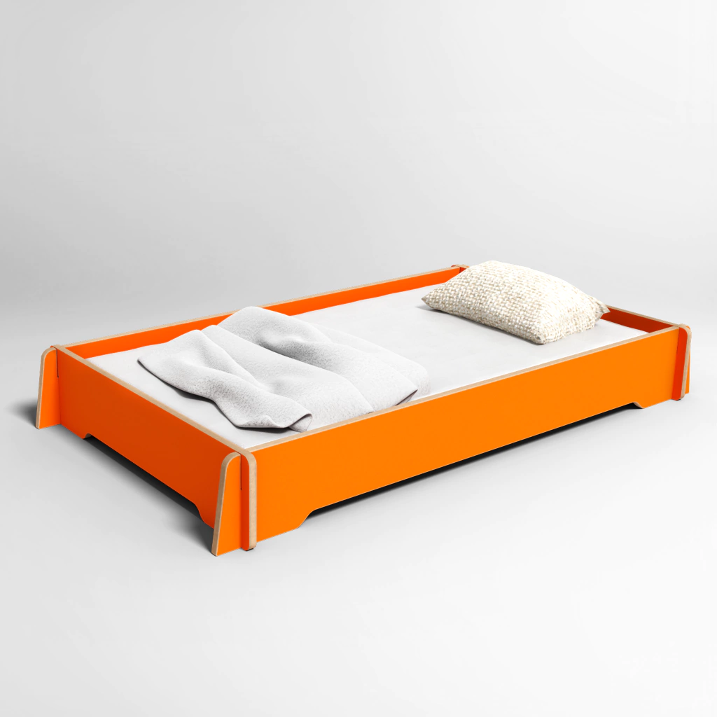 La particularidad de este modelo es que la Cama Hija (Tatami), se puede guardar dentro de la Cama Madre (evolutiva) mientras que está en posición cama baja. Una vez que la Cama evolutiva Madre se voltea se puede colocar debajo como la Cama Nido.