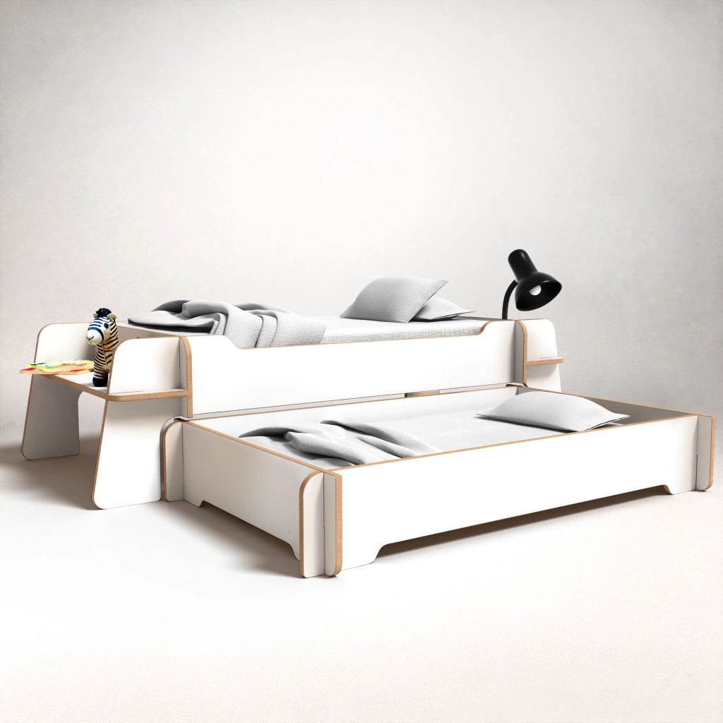 La Cama Nido TUKI, gracias a su diseño inteligente, esta cama alta optimiza el espacio de la habitación, guardando la cama baja de manera ingeniosa. Además, incluye prácticas mesitas de luz y rincones multipropósito en cada cabecera, ideales como mesita de luz, organizar juguetes, zapatos ¡o simplemente crear un hermoso rincón de lectura!