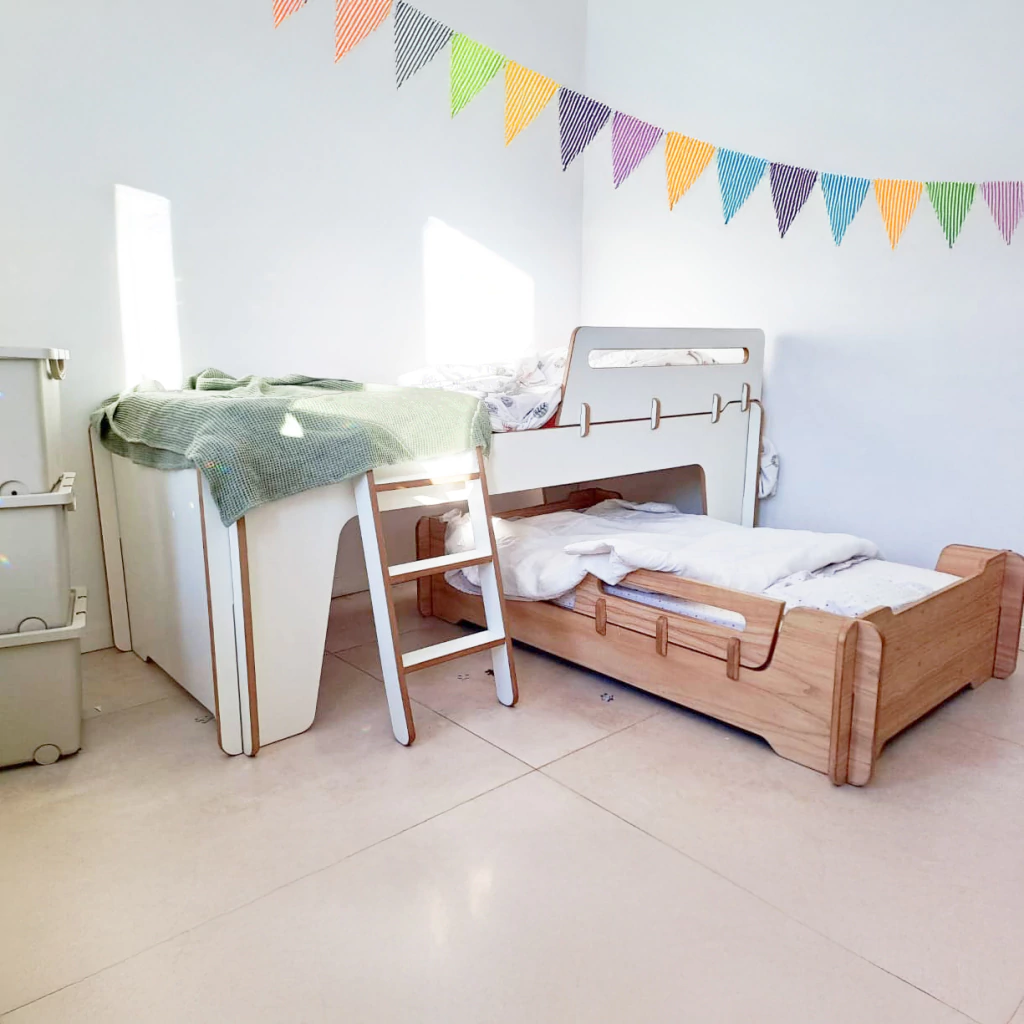 Podés combinarla con la Cama Montessori o la Cama Evolutiva y armar un espacio compartido sin perder estilo ni comodidad.